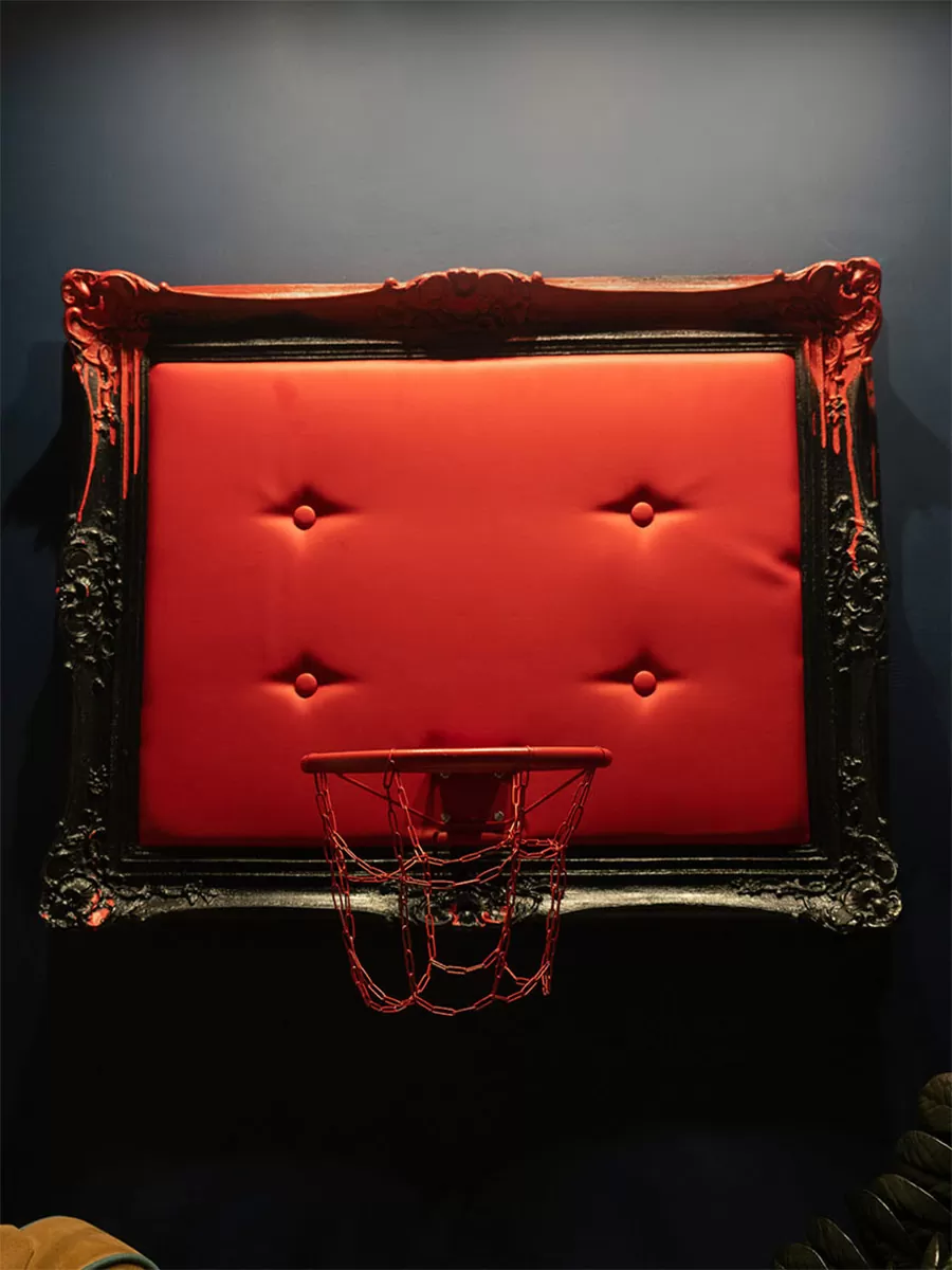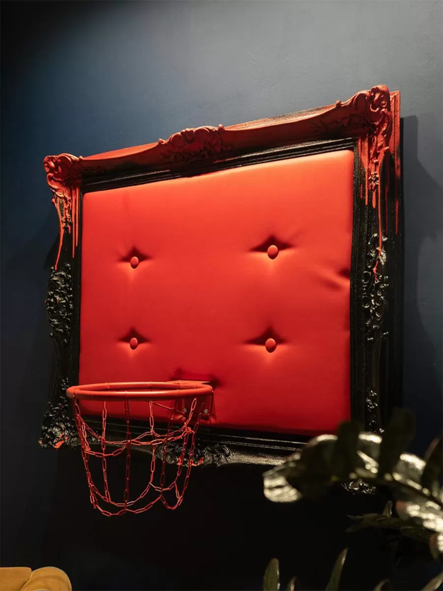 Fire frozen in luxury. A black frame with crimson drips, red leather, and a hoop — as if torn straight from the epicenter of passion. This art piece detonates the space with its powerful energy and absolute audacity.