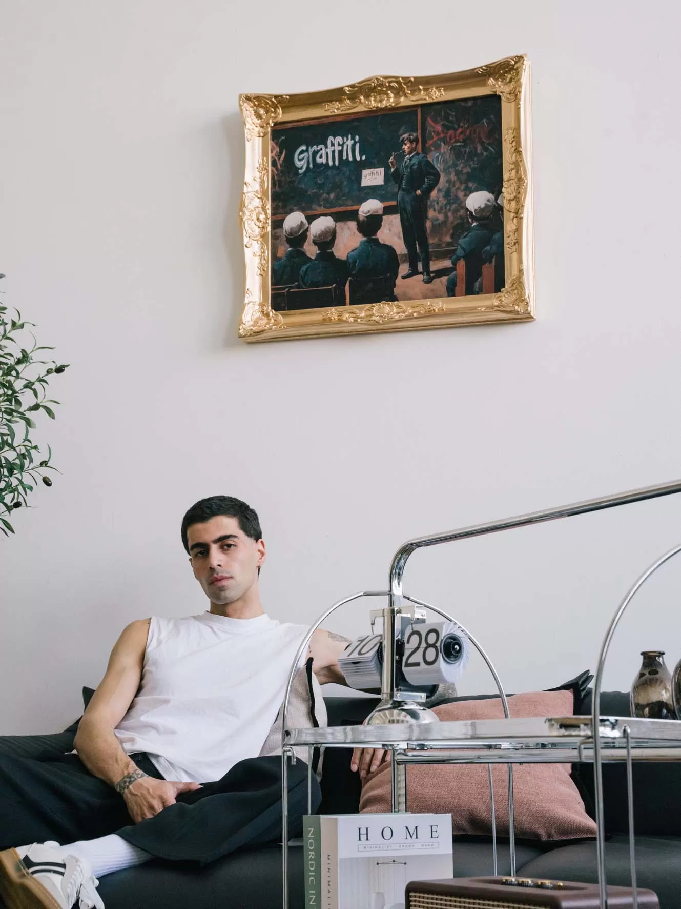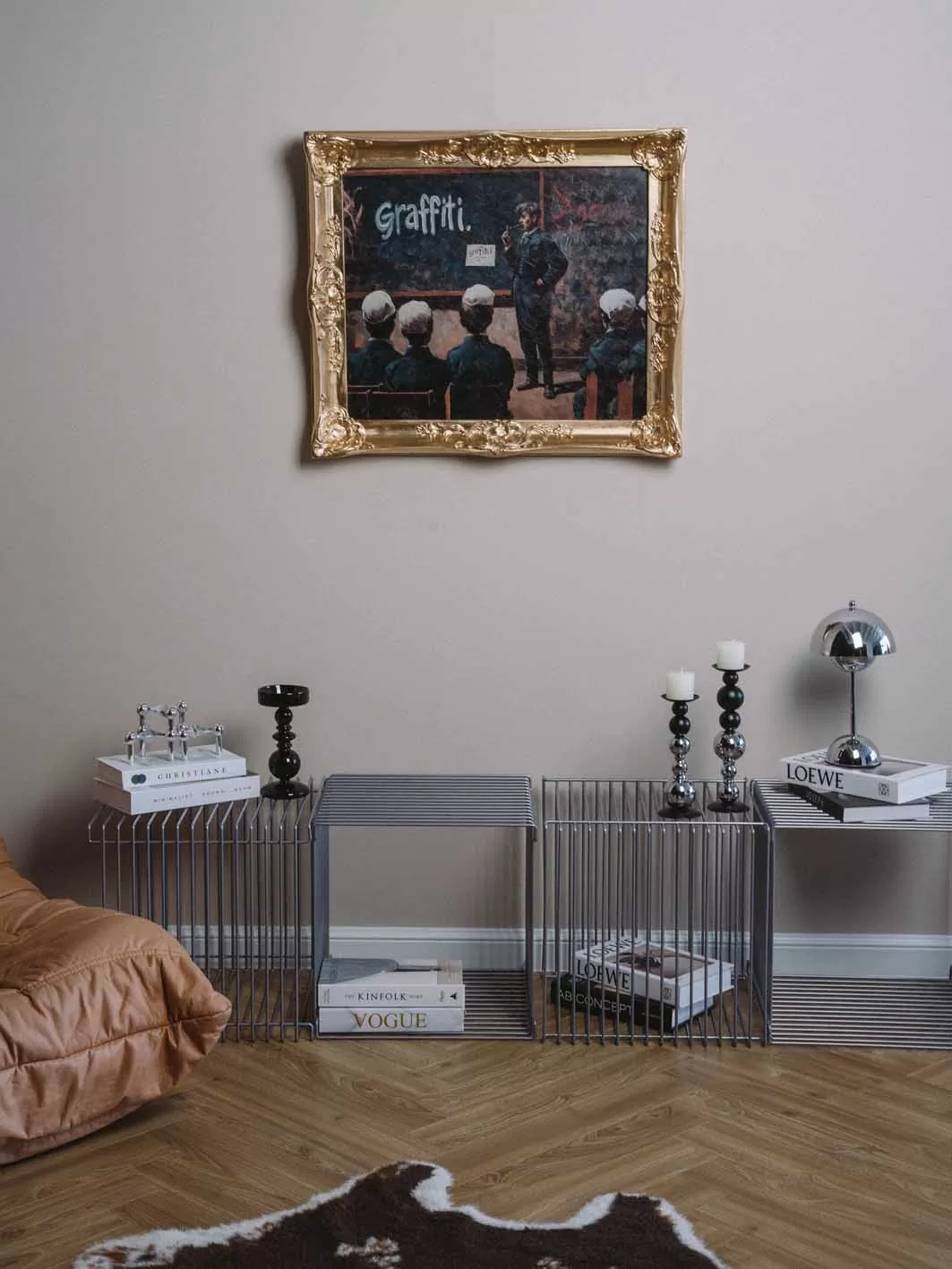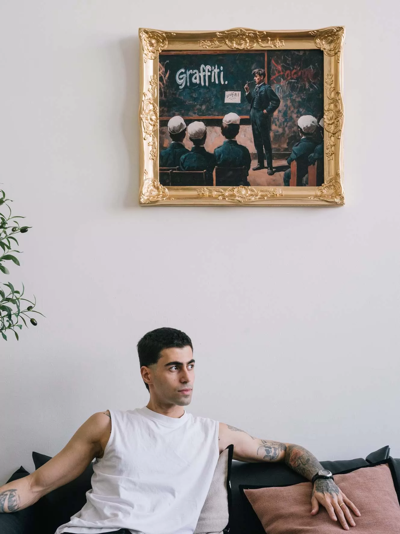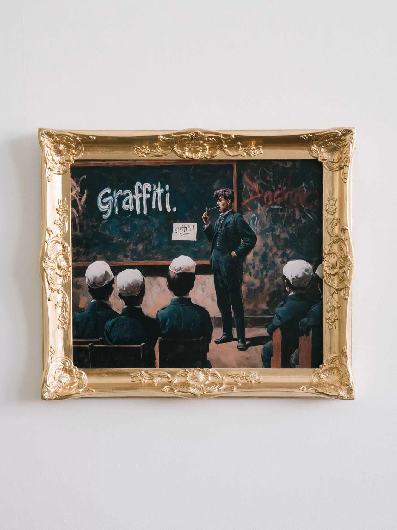 The gilded frame adds a touch of irony—classical tradition and street art collide in a single scene. Who’s really in charge here—the teacher or the rebellious spirit of creativity?